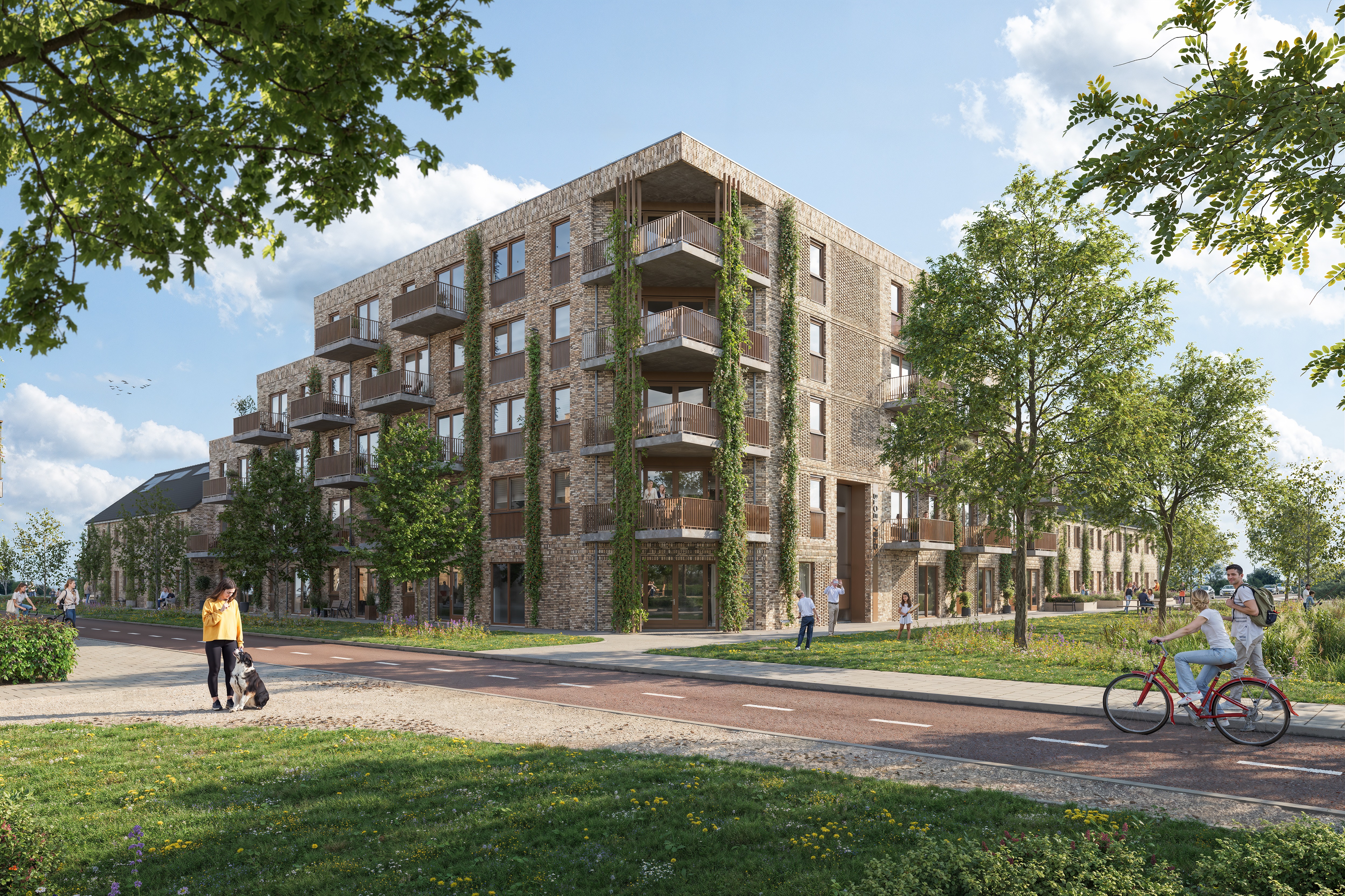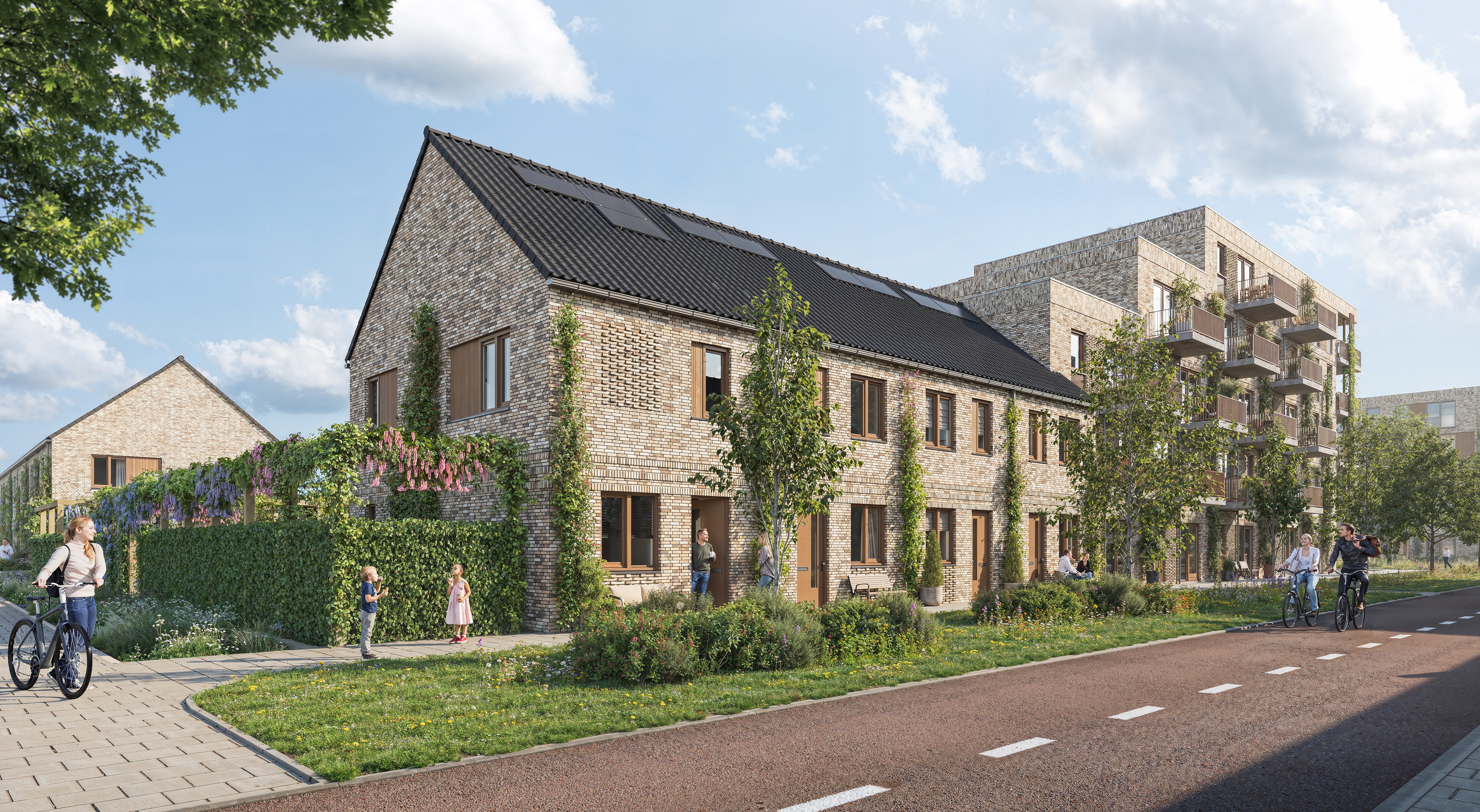 Kinderen spelen in het buurtpark, op een veilige speelplek. Voor de woningen komen kleine voortuintjes, waar bewoners gezellig een kopje koffie kunt drinken of een praatje kunt maken. Omdat de buurt rustig en autoluw is, kun je veilig wandelen en fietsen. Auto’s staan uit het zicht, op groene parkeerplekken achter de huizen onder houten overkappingen.